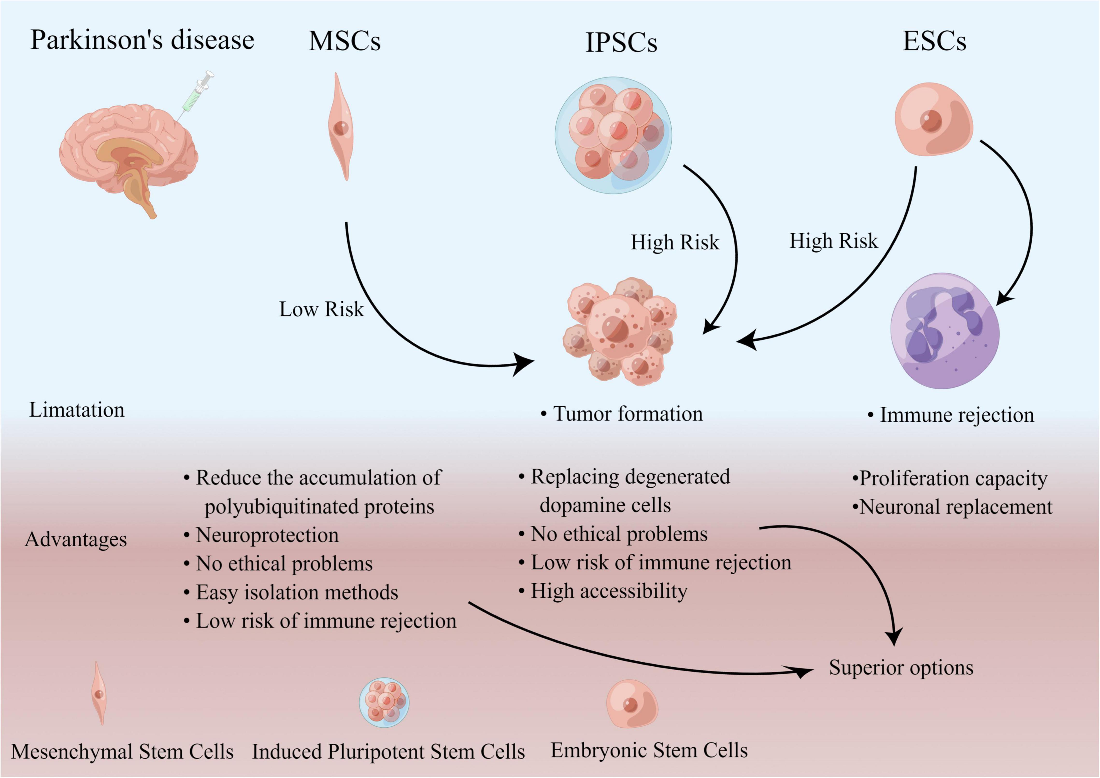 間充質干細胞被用于PD治療,可能是因為它們具有由抗炎特性和旁分泌因子驅動的神經保護潛力。在過去的幾年中,大多數研究人員旨在評估MSCs在減少細胞凋亡和神經元細胞存活方面的積極影響。此外,MSCs減少了多聚泛素化蛋白的積累,從而促進了移植性帕金森病的發病機制。值得注意的是,與糖尿病等慢性疾病不同,帕金森病患者擁有功能齊全的MSC,在數量、質量、可塑性和免疫反應方面與健康細胞相當。