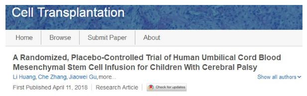 2018年,西安交通大學(xué)醫(yī)學(xué)院神經(jīng)生物學(xué)研究所呂海俠教授在細(xì)胞移植期刊(Cell Transplantation)上發(fā)表了一篇研究成果。通過隨機(jī)、安慰劑對照的臍帶血間充質(zhì)干細(xì)胞輸注治療腦癱患兒,結(jié)果顯示臍帶血治療組患兒的癥狀改善程度顯著優(yōu)于對照組。證實(shí)臍帶間充質(zhì)干細(xì)胞治療腦癱安全且效果顯著。