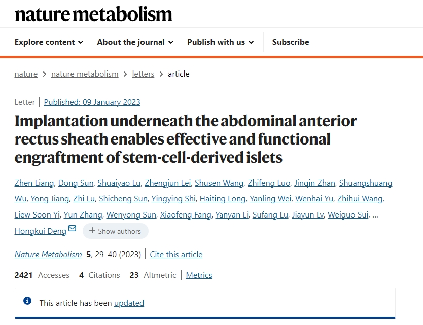 該手術方案安全、 易行、移植物易于長期追蹤觀察,且能夠有效支持hPSC-islets的早期細胞存活和長期功能維持。團隊將hPSC-islets輸注到糖尿病模型猴的腹直肌前鞘下部位,所有接受移植的糖尿病猴血糖控制均得到了顯著改善;同時,模型猴內源性胰島素的分泌水平也得到了大幅提升,且能夠響應機體血糖濃度的變化。相關研究成果發表在《Nature Metabolism》 雜志上, 題為 “Implantation underneath the abdominal ?anterior rectus sheath enables effective ?and functional engraftment of stem ?cell-derived islets”。?