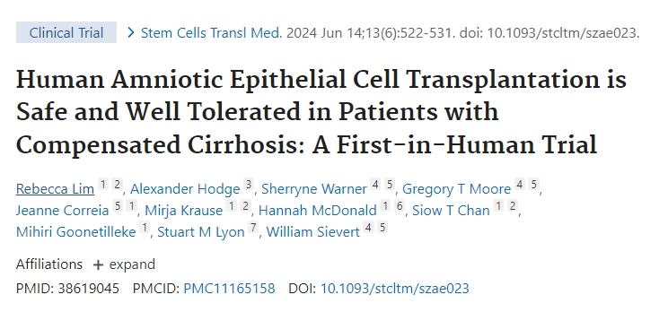 2024年,《干細胞移植醫(yī)學》發(fā)表了一篇“人類羊膜上皮細胞移植對代償性肝硬化患者安全且耐受性良好:首次人體試驗”臨床研究的文章。