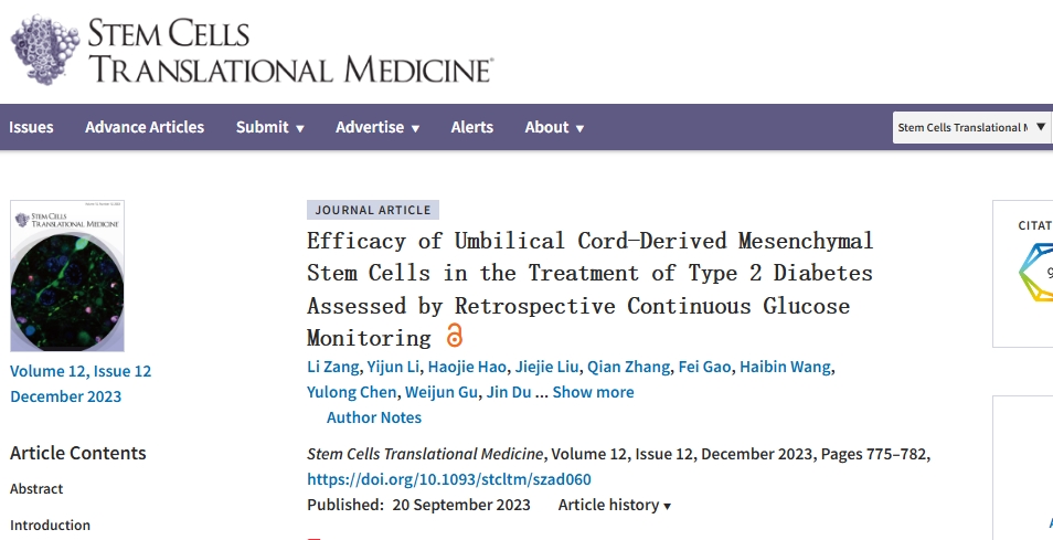 2023年,解放軍總醫院第一醫學中心在權威期刊雜志《干細胞轉化醫學》發表了一篇有關過回顧性連續血糖監測評估臍帶間充質干細胞治療2型糖尿病的療效”的臨床研究文章[1]。
