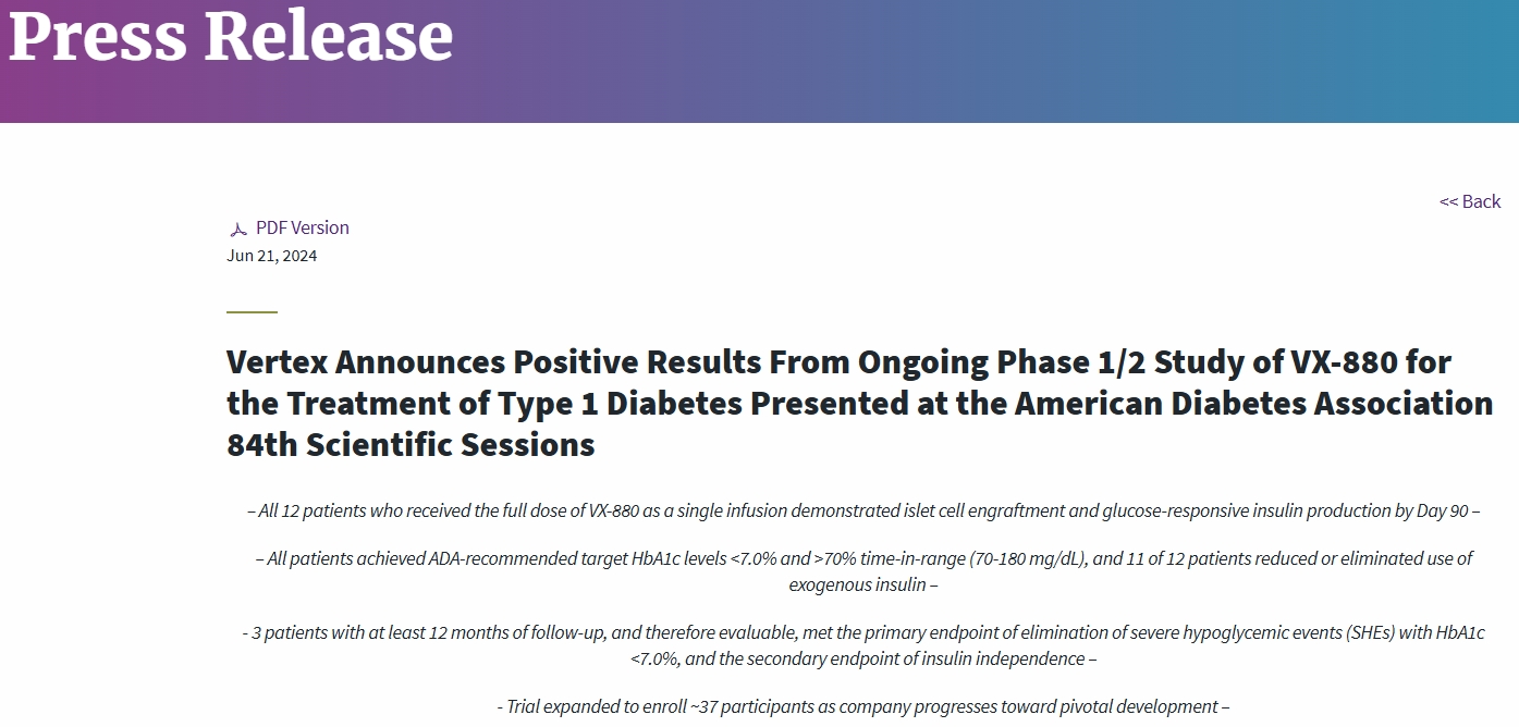 2024年6月,Vertex宣布正在進行的VX-880治療1型糖尿病的1/2期研究取得積極成果,并在美國糖尿病協會第84屆科學會議上發表。