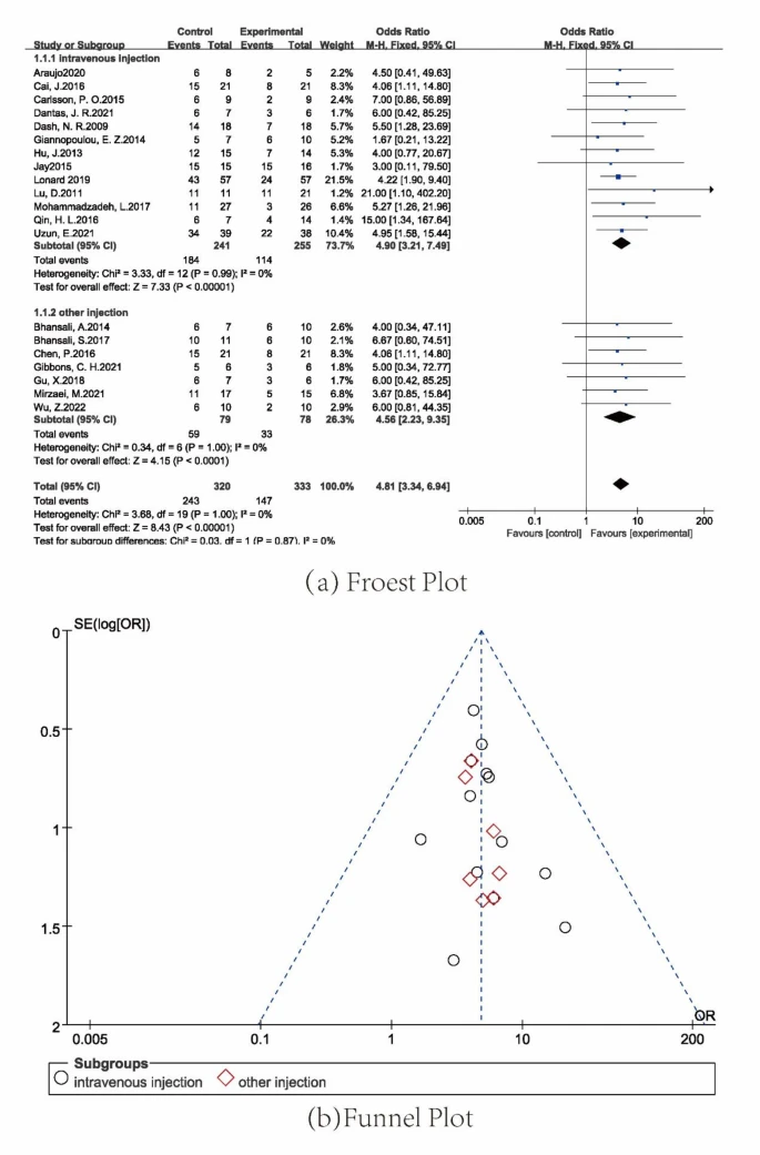 本研究通過(guò)薈萃分析評(píng)估不同MSCs注射方式對(duì)糖尿病治療的療效差異。基于20項(xiàng)研究(12項(xiàng)靜脈注射、8項(xiàng)其他注射)的數(shù)據(jù)進(jìn)行分析。