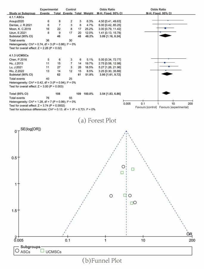 基于11項(xiàng)研究(8項(xiàng)足潰瘍、3項(xiàng)神經(jīng)病變)的數(shù)據(jù)顯示,兩組療效高度一致,且組間無(wú)顯著差異(P=0.84)。異質(zhì)性檢驗(yàn)(I2=0)及森林圖分布(圖10b)證實(shí)結(jié)果高度可靠,提示MSCs對(duì)不同糖尿病并發(fā)癥的療效具有普適性,為臨床擴(kuò)展應(yīng)用提供了證據(jù)支持。