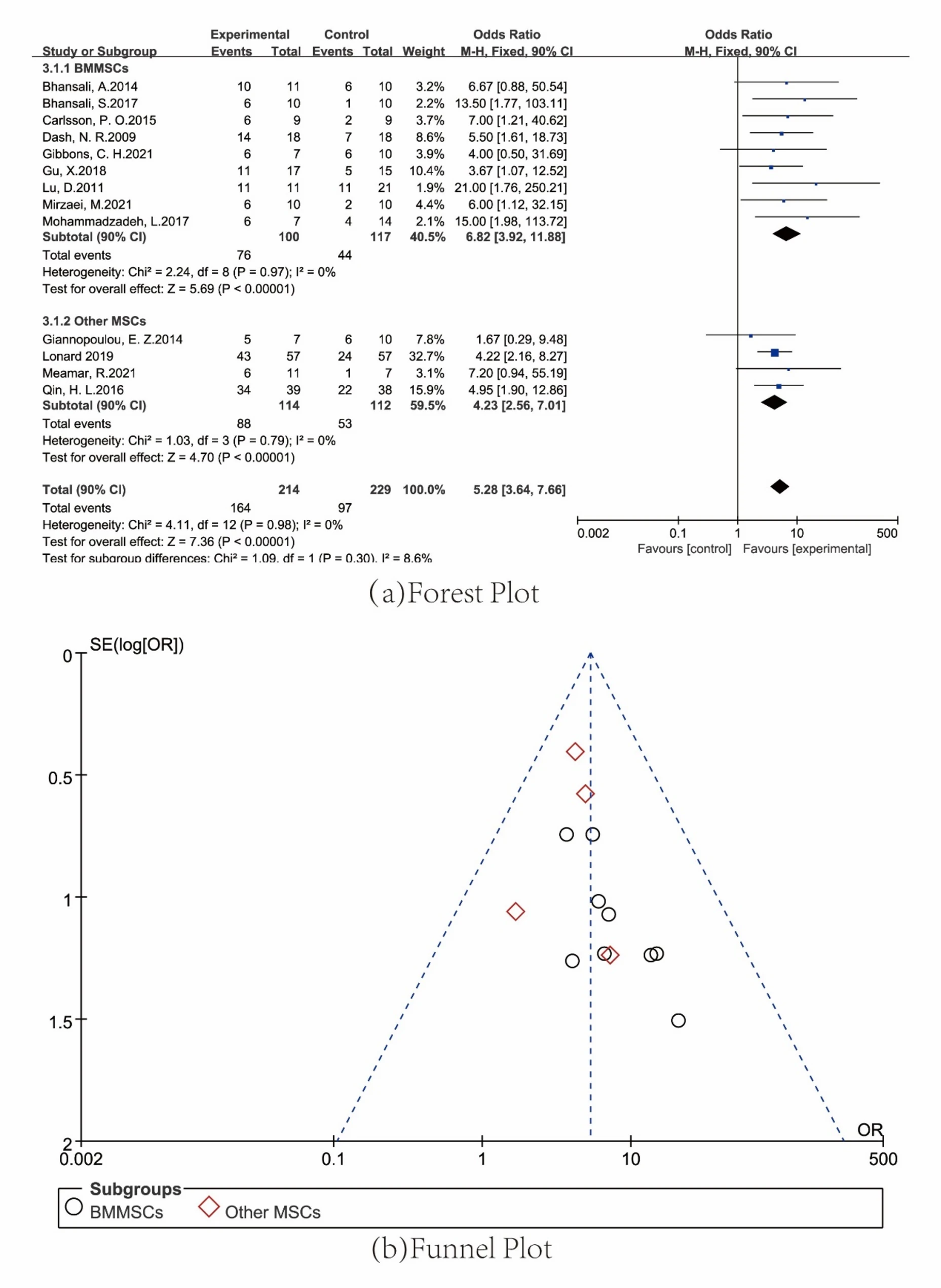 自體MSCs亞型的療效與特性對(duì)比:自體間充質(zhì)干細(xì)胞(MSCs)中,骨髓源性MSCs(BMMSCs)在糖尿病治療中表現(xiàn)最優(yōu),其薈萃分析OR值達(dá)6.82(實(shí)驗(yàn)組100例vs對(duì)照組117例),顯著高于其他來(lái)源MSCs(OR=4.23),這表明BMMSC在糖尿病治療中具有更重要的作用(圖6ab)。