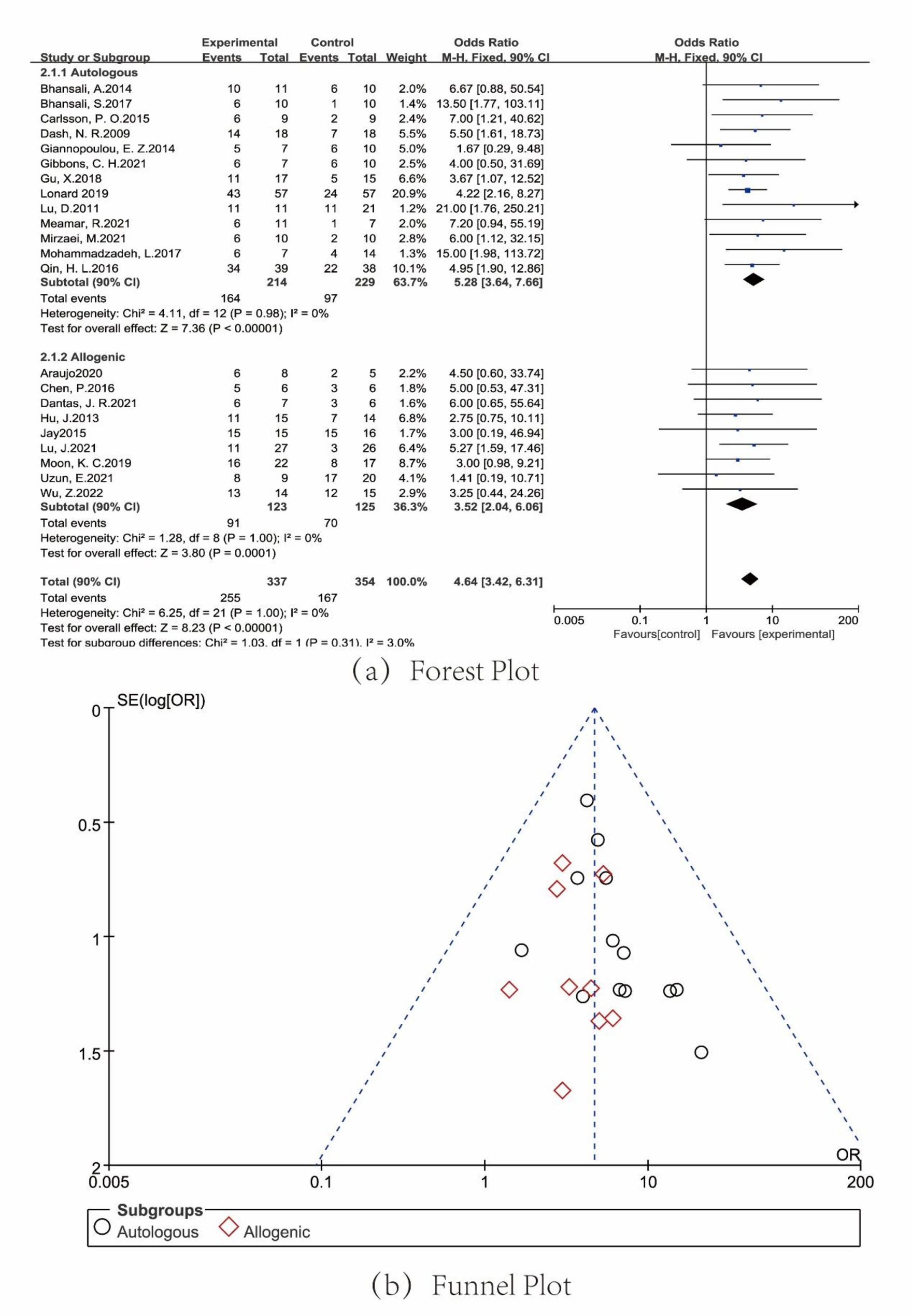 自體干細(xì)胞來(lái)源包括骨髓、臍帶、脂肪和胎盤(pán)。在確保自體MSCs療效優(yōu)于同種異體MSCs后,進(jìn)一步分析了BMMSCs和其他MSCs兩大類(lèi)。