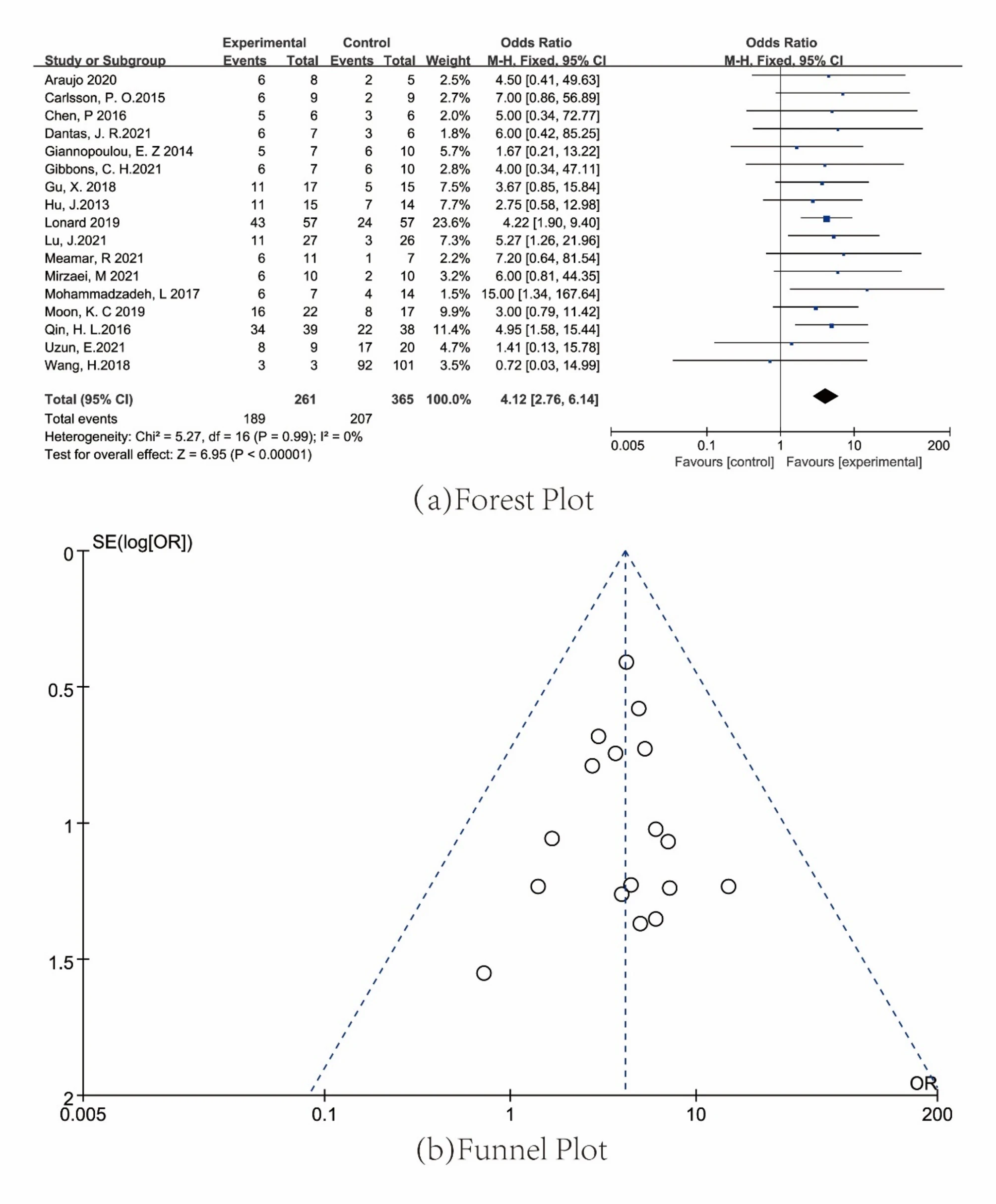 數(shù)據(jù)顯示:靜脈注射組(實(shí)驗(yàn)事件241例,對(duì)照255例)OR值為4.90,其他注射組(實(shí)驗(yàn)事件79例,對(duì)照78例)OR值為4.56,表明兩種策略療效相近,無(wú)論靜脈或肌肉/肘前靜脈注射,MSCs均能顯著改善糖尿病(圖9)。