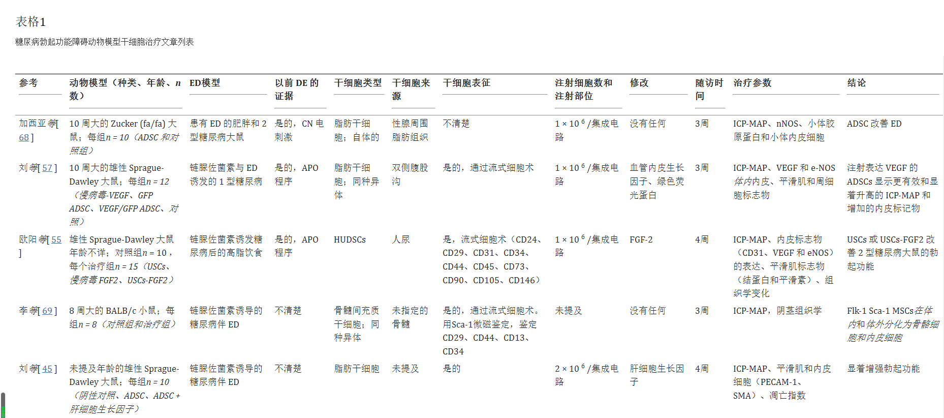自2000年代以來,就一直在開展ED病例的干細(xì)胞研究。然而,大多數(shù)研究僅限于實(shí)驗(yàn)動(dòng)物。在本文回顧的 25項(xiàng)研究中,我們發(fā)現(xiàn)其中21項(xiàng)是在動(dòng)物身上進(jìn)行的(表1) 和四個(gè)關(guān)于人類的 (表2)。