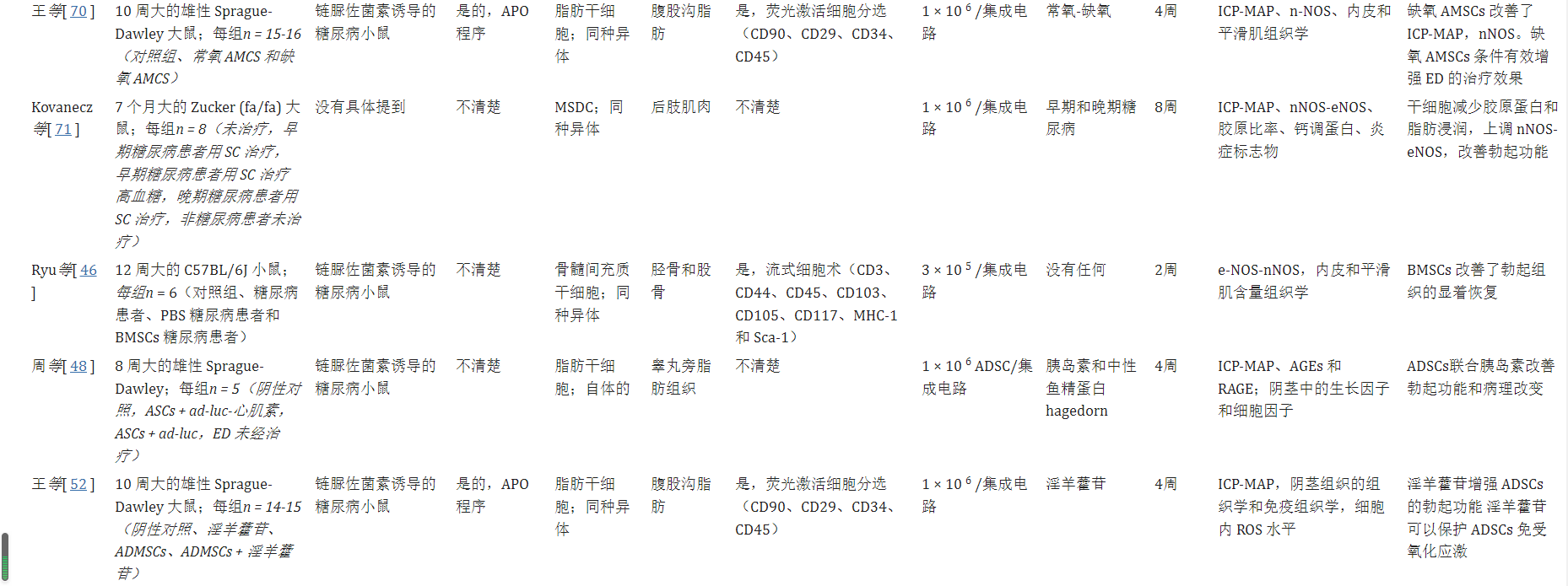 2019年,Protogerou等人報(bào)道了一種不同的方法,即使用自體脂肪干細(xì)胞治療5名DM患者的ED。將該組與其他五個(gè)接受血小板裂解物的人進(jìn)行了比較。給予的干細(xì)胞數(shù)量為2×105個(gè)細(xì)胞,持續(xù)3個(gè)月。在研究結(jié)束時(shí),在治療組和對照組之間沒有觀察到IIEF-5的差異。然而,兩組在治療前后均觀察到顯著改善。
