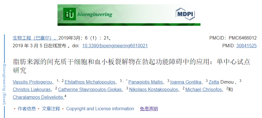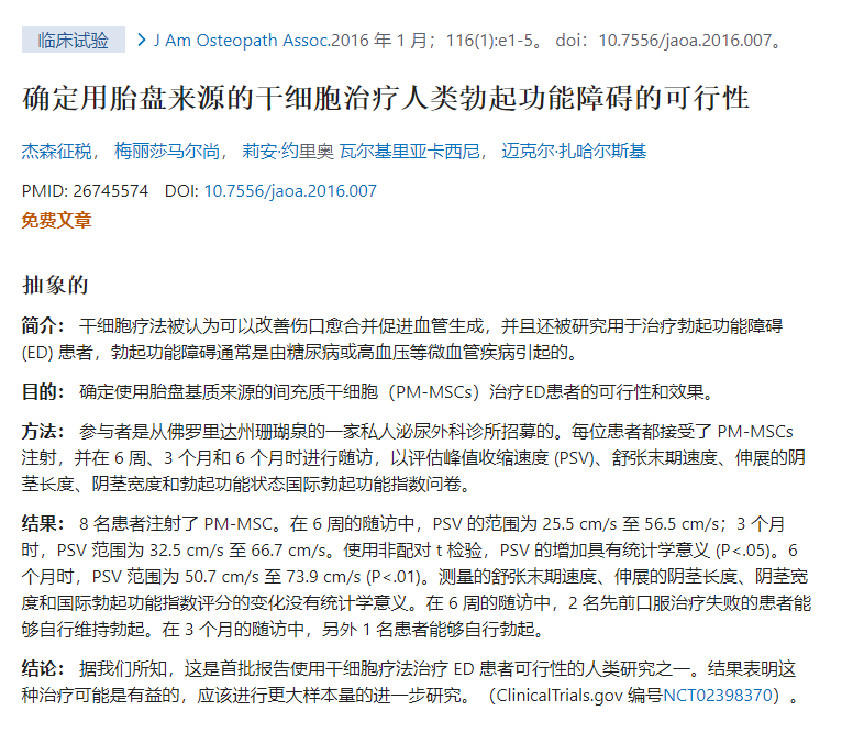 2016年,Levy等人報(bào)道了PM-SCs(胎盤基質(zhì)干細(xì)胞)在8名ED患者中的應(yīng)用。治療后6個(gè)月后,Levy等人得出結(jié)論,干細(xì)胞療法可改善勃起功能。