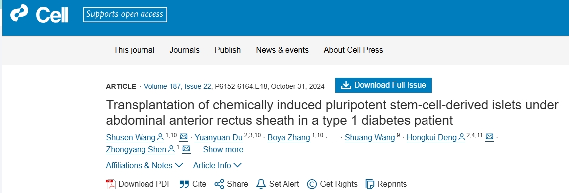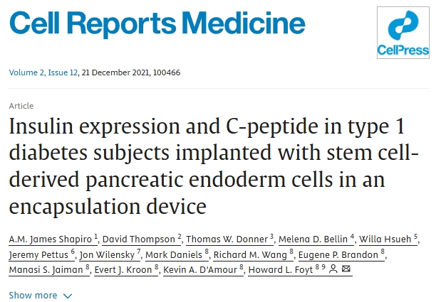 該試驗評估了在腹部前直肌鞘下自體移植化學誘導的多能干細胞來源的胰島 (CiPSC 胰島) 治療1型糖尿病的可行性。患者在移植后75天開始實現持續的胰島素依賴。患者的血糖達到目標范圍時間從基線值的43.18%增加到移植后第4個月的96.21%,同時糖化血紅蛋白 (長期全身血糖水平處于非糖尿病水平的指標) 下降。