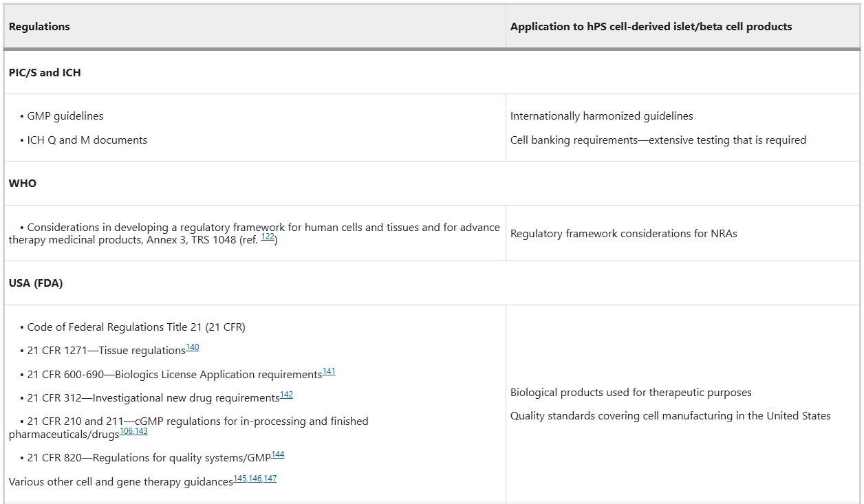 除了特定司法管轄區的規定外,藥品檢驗合作計劃 (PIC/S)、人用藥品技術要求國際協調會 (ICH) 和世界衛生組織 (WHO) 等國際組織還匯編了細胞和基因治療產品的協調和指導文件。不同國家監管機構 (NRA) 針對細胞治療產品編寫的指南匯編已在其他地方概述。在這里,我們重點介紹了與生成用于臨床應用的hPS細胞衍生的胰島/β細胞相關的關鍵監管考慮因素。