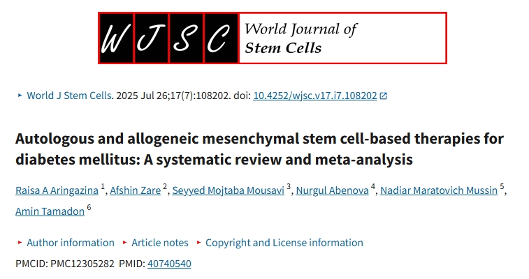 [1]:Aringazina RA, Zare A, Mousavi SM, Abenova N, Mussin NM, Tamadon A. Autologous and allogeneic mesenchymal stem cell-based therapies for diabetes mellitus: A systematic review and meta-analysis. World J Stem Cells. 2025 Jul 26;17(7):108202. doi: 10.4252/wjsc.v17.i7.108202. PMID: 40740540; PMCID: PMC12305282.