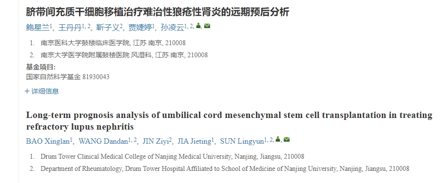2023年5月23日,南京大學醫學院附屬鼓樓醫院在行業期刊《實用臨床醫藥雜志》上發表了一篇關于《臍帶間充質干細胞移植治療難治性狼瘡性腎炎的遠期預后分析》的研究成果。【4】