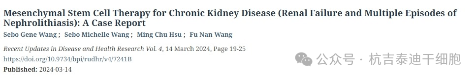 2024年3月14日,中國(guó)科研人員在期刊《疾病與健康研究最新更新》上發(fā)表了一篇關(guān)于《間充質(zhì)干細(xì)胞治療慢性腎病(腎衰竭和多次發(fā)作的腎結(jié)石)》的臨床病例報(bào)告。[3]