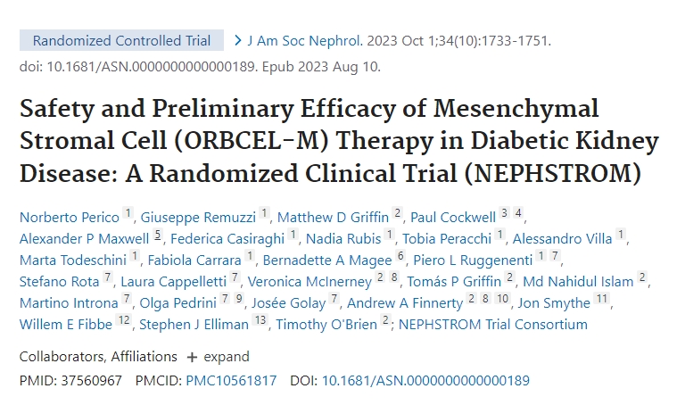 Perico, N. et al. Safety and preliminary efficacy of mesenchymal stromal cell (ORBCEL-M cell) therapy in diabetic kidney disease: a randomized clinical trial (NEPHSTROM).?J. Am. Soc. Nephrol.,?