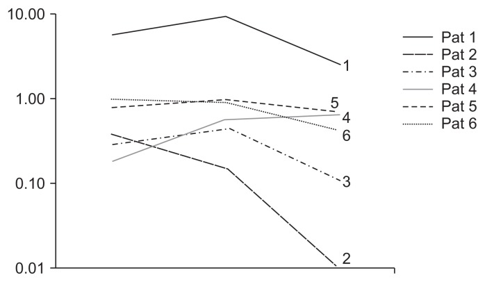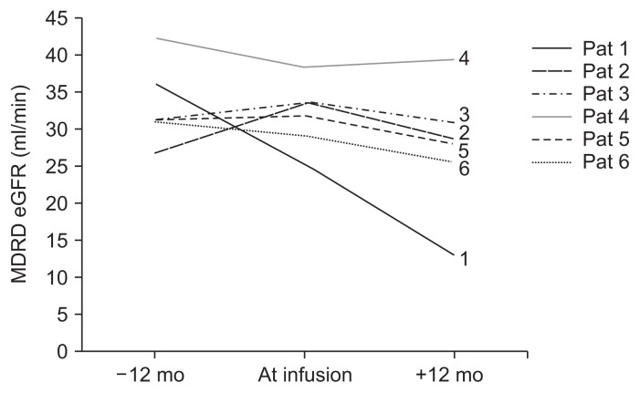 注射AT-MSC前后12個月時,通過血漿肌酐和MDRD估計的腎小球濾過率 (eGFR) 估計的腎功能。除患者4外,所有個案均顯示MDRD eGFR 略有下降,范圍從7.5%到 49%。每個患者治療前和治療后的回歸分析的eGFR斜率沒有顯著差異。為了簡化曲線,僅描繪了主要的三個時間點(治療前12個月、輸注時間、治療后12個月)。