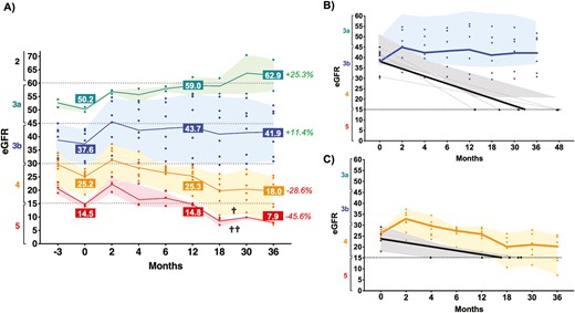 (A) 總體腎功能。從治療前3個月到治療后36個月,每位患者(彩色點)的 eGFR(按慢性腎病類別分組)和每個階段組的平均值(實線),4個不同患者組以陰影表示顏色(3a – 綠色;3b – 藍色;4 – 橙色;5 – 紅色)。36個月時患者組的eGFR(腎功能)總體百分比改善(+,綠色)或惡化(-,紅色)。