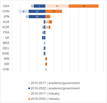 各國之間存在明顯差異。在美國,行業(yè)贊助的試驗數(shù)量超過學(xué)術(shù)/政府贊助的試驗(分別為32項和9項),甚至在2018年之前就具有很強(qiáng)的代表性,而中國和日本僅在過去5年內(nèi)才開始有行業(yè)贊助的試驗,并且由于強(qiáng)大的國家資助計劃,他們的大部分試驗仍然主要由學(xué)術(shù)/政府贊助(袁等,2012;‘江之澤,2022年;李2022)。