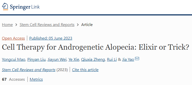 蘭州大學(xué)第一臨床醫(yī)學(xué)院在國際學(xué)術(shù)期刊《干細(xì)胞評論和報告》上發(fā)布了一篇《細(xì)胞療法治療雄性激素性脫發(fā)癥:靈丹妙藥還是小把戲?》的文章,文章就目前干細(xì)胞治療AGA的方法、療效、作用機制及臨床進展進行綜述,希望能為脫發(fā)患者在干細(xì)胞治療領(lǐng)域提供更全面的視角。