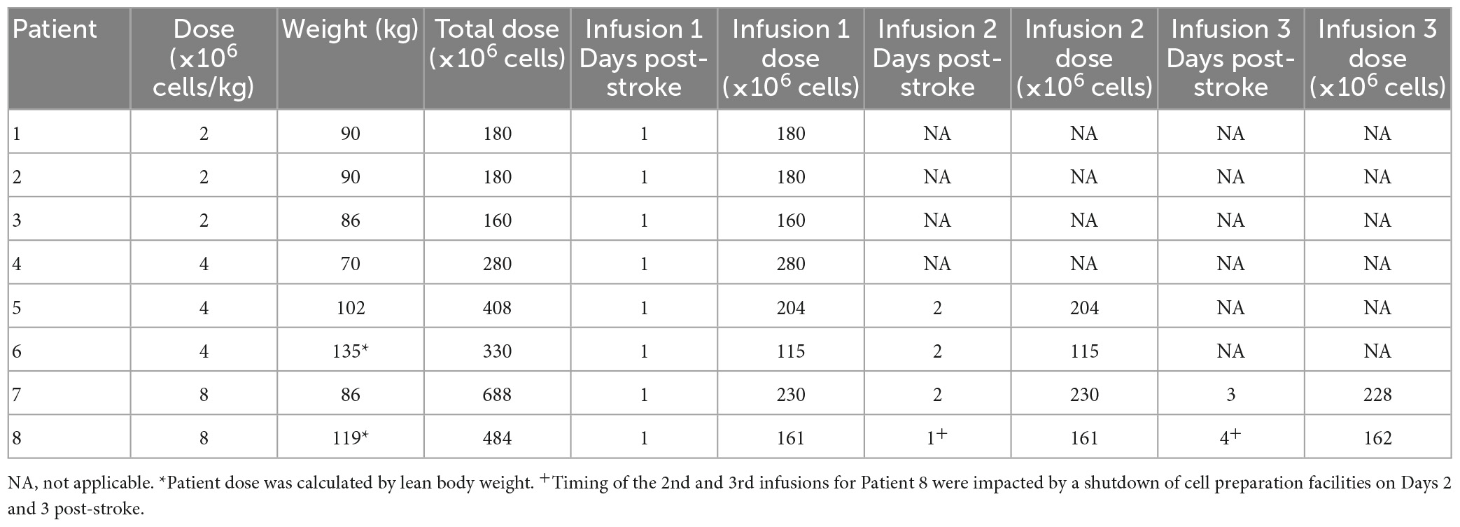 該I期試驗(yàn)的臨床方案先前已發(fā)布。我們?cè)谙旅嫣峁┝思{入和排除標(biāo)準(zhǔn)的摘要。給藥方案是根據(jù)兩名體型較大的患者(患者6和8)的去脂體重計(jì)算的。由于招募率較低,我們修改了第一階段試驗(yàn)的原始計(jì)劃,以納入接受溶栓治療的患者。這一步驟得到了我們的動(dòng)物實(shí)驗(yàn)的支持,表明hAEC與阿替普酶(手稿正在準(zhǔn)備中)聯(lián)合給藥時(shí)可提供神經(jīng)保護(hù)。當(dāng)試驗(yàn)的主要終點(diǎn)(確定安全劑量范圍和最大耐受劑量)被認(rèn)為已達(dá)到時(shí),試驗(yàn)終止,招募了8名患者。