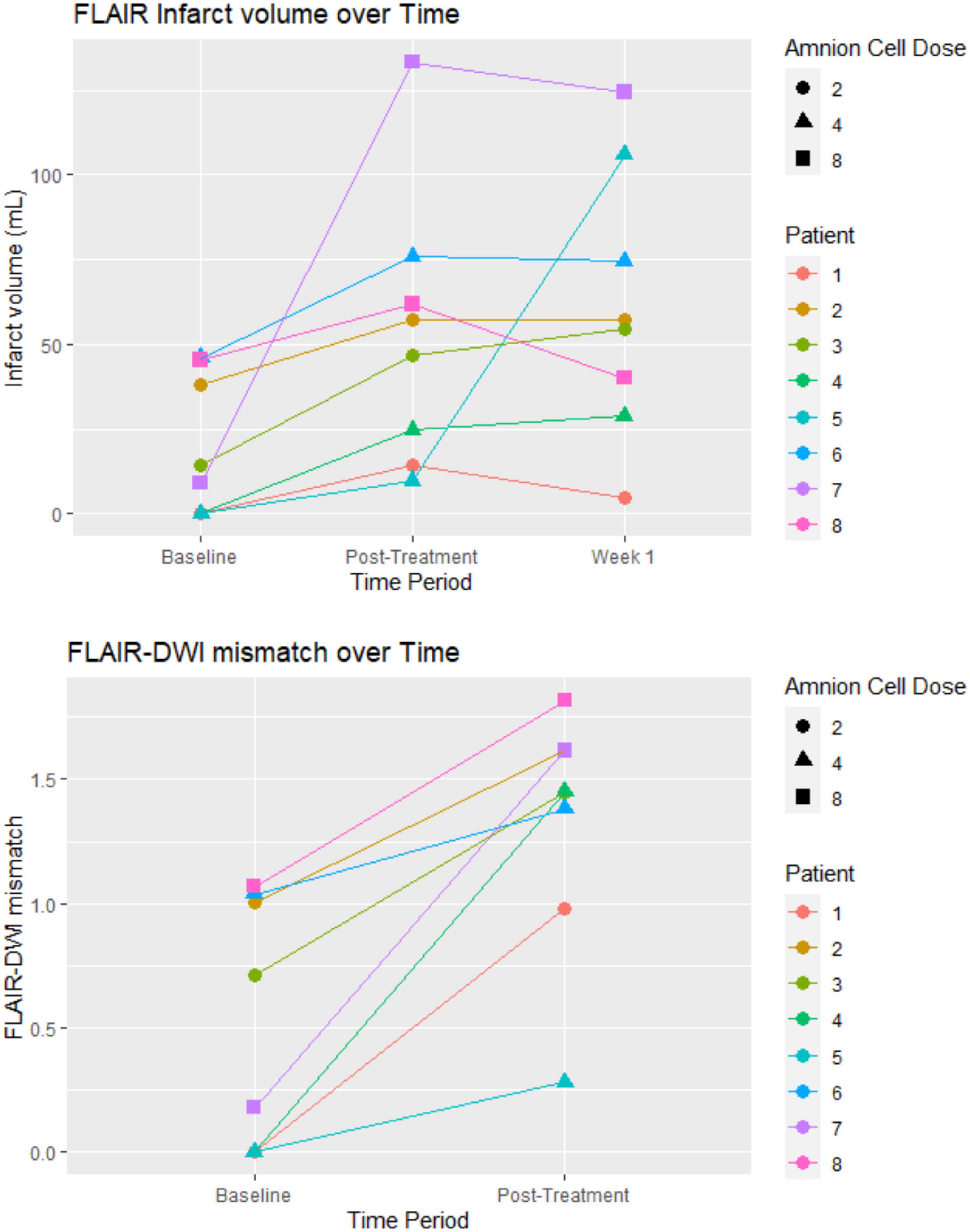圖1說(shuō)明第一周梗塞體積的變化。細(xì)胞輸注完成后,八名患者中有七名的梗塞體積沒(méi)有明顯增加。患者4在接受hAEC后的第二天再次出現(xiàn)中風(fēng),患者7在完成hAEC輸注之前出現(xiàn)明顯的梗塞生長(zhǎng),但NIHSS沒(méi)有出現(xiàn)臨床惡化。NIHSS從入院時(shí)的15降至7天時(shí)的10(表1)。基線時(shí)FLAIR成像的中位梗塞體積為11.74ml(IQR0, 39.89)。基線DWI中位缺血體積為29.10ml(IQR6.99,42.92)。治療后的中位梗塞體積為52.05ml(UQR22.2,65.4)。1周時(shí)的中位梗塞體積為55.77ml(IQR37.26,82.28)。