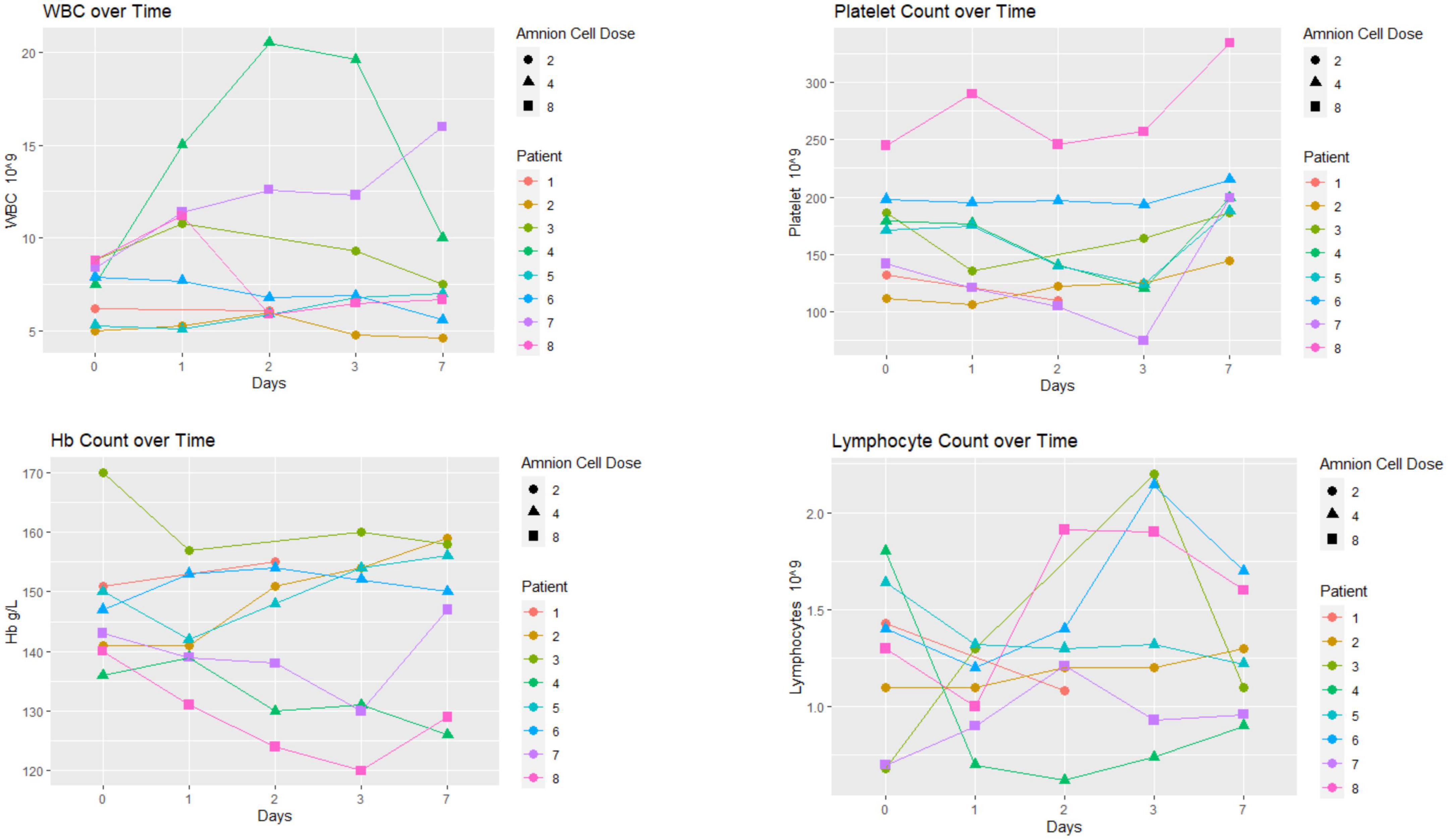 免疫學(xué)變化如圖3、4所示。在這8名患者中沒(méi)有觀察到特殊的模式。簡(jiǎn)而言之,結(jié)果沒(méi)有顯示出明顯的趨勢(shì),特別是在hAEC的效果方面(例如,接受最高劑量的患者7和8與接受最低劑量的患者1-3之間)。我們無(wú)法檢測(cè)(或檢測(cè)到低水平)幾種炎癥標(biāo)志物(IFN-γ、IL-6、TNF、IL-10和IL-17)。高敏CRP和MMP-9水平保持在正常范圍內(nèi)。在三名患者(患者1-3)中,MMP-9水平在第一周內(nèi)沒(méi)有變化。
