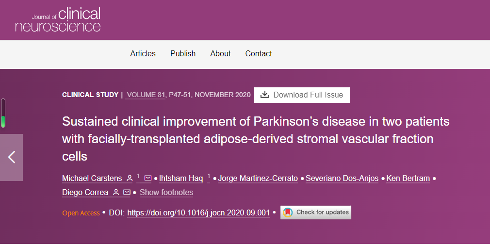 2020年維克森林大學(xué)再生醫(yī)學(xué)研究所,兩名PD患者接受了自體脂肪源性血管基質(zhì)成分 (SVF) 治療。它們被直接給予面部和鼻子的肌肉。SVF后,兩名患者的運(yùn)動(dòng)表現(xiàn)均有所改善,且多巴胺能治療水平較低。盡管作用機(jī)制未知,但這種潛在的療法需要進(jìn)一步研究。