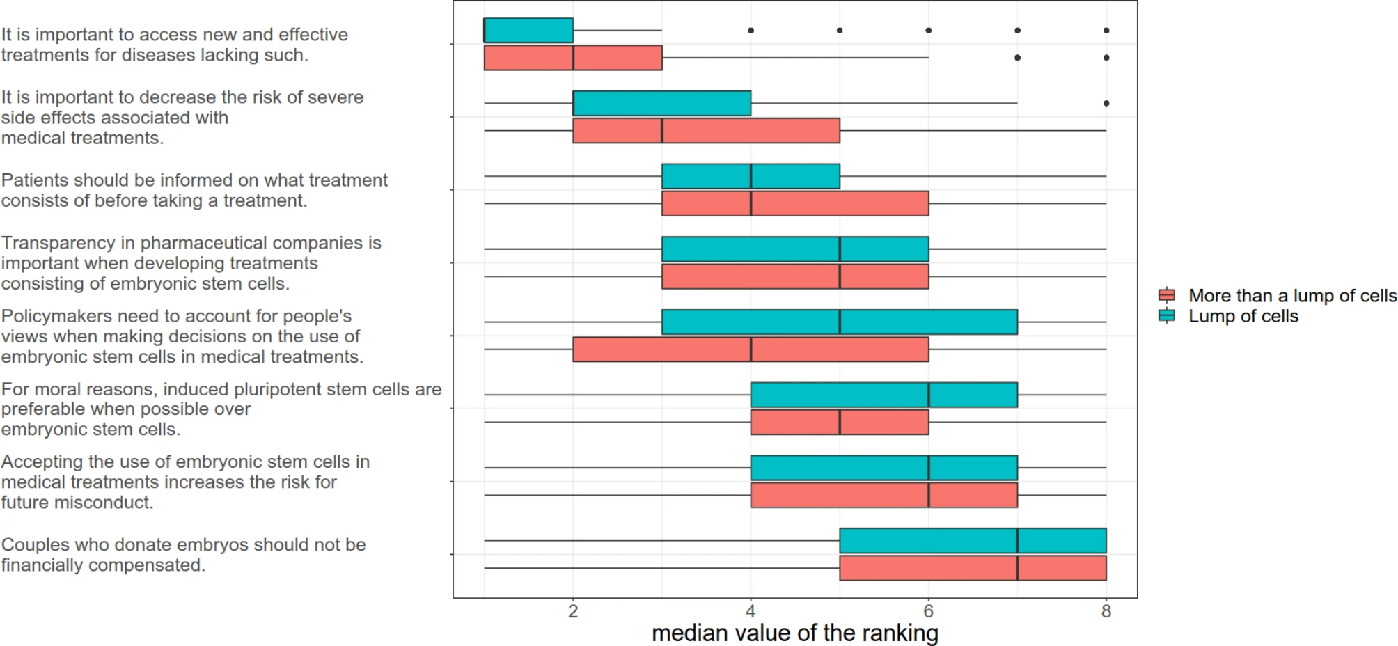 作為排名練習的一部分,PD患者對八個陳述進行了排名(圖2)。結果以“不僅僅是一團細胞”和“一團細胞”亞組呈現,以表明受訪者的排名并不取決于他們對胚胎的看法。排名最高的說法是“針對缺乏此類疾病的疾病獲得新的有效治療方法非常重要”;第二個是“降低與醫療相關的嚴重副作用的風險非常重要。”