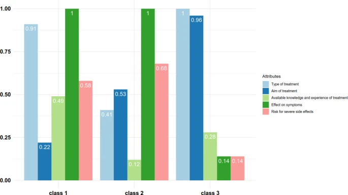 帕金森病患者被邀請完成一項基于網絡的離散選擇實驗,以評估以下屬性的重要性:(i) 治療類型,(ii) 治療目的,(iii) 不同類型治療的現有知識,( iv) 對癥狀的影響,以及 (v) 嚴重副作用的風險。潛在類別條件邏輯回歸模型用于確定偏好估計和受訪者偏好的異質性。