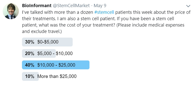 全球最大的干細(xì)胞行業(yè)新聞出版商BioInformant開展了一次調(diào)查,他們收集了接受過干細(xì)胞治療的讀者的費(fèi)用清單,并在Twitter上展開了問卷。共收到了數(shù)百條回復(fù)。根據(jù)調(diào)查結(jié)果顯示: