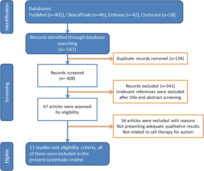 方法:共確定了547項研究,其中11項研究被認為有資格納入本次審查,因為它們已完成細胞療法臨床試驗或臨床應用,并在治療自閉癥患者方面取得了定量結果(圖1)。