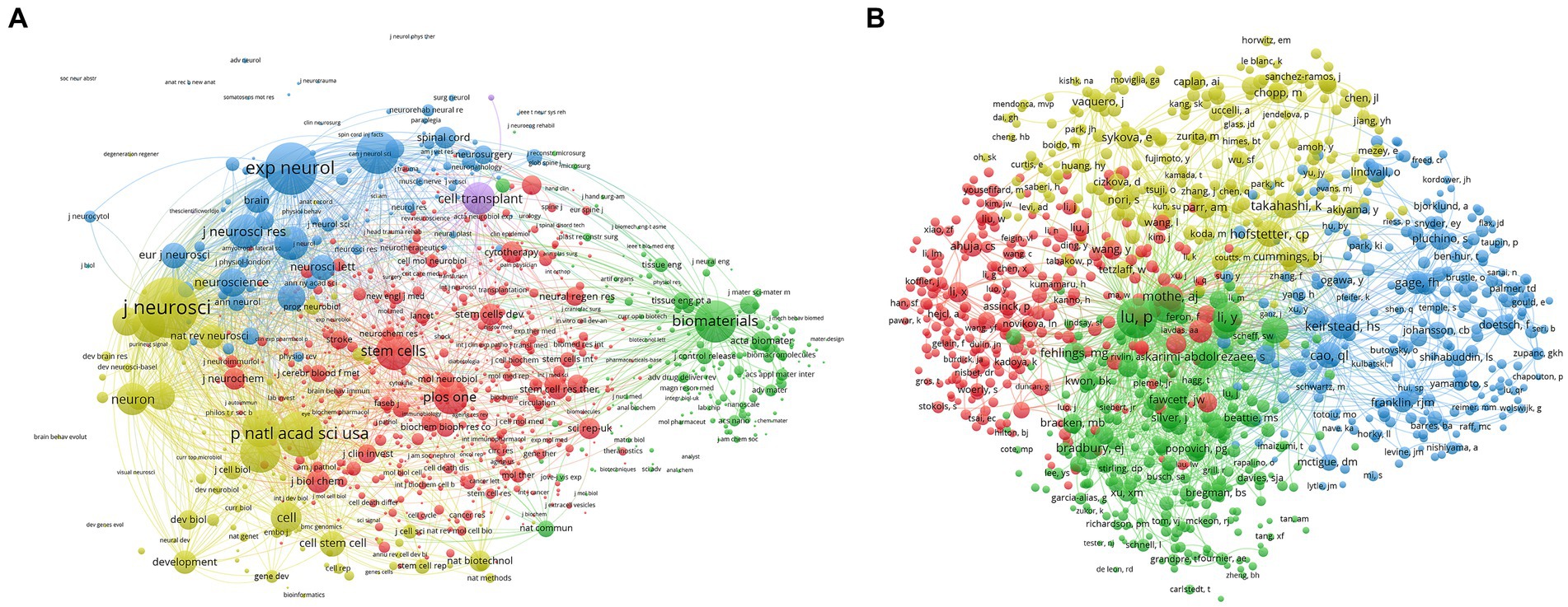 (B)1,000位作者對脊髓損傷研究干細胞療法的共被引分析的映射。點的大小代表兩個期刊/作者已經建立了合作。線條越粗,兩個期刊/作者之間的聯系越緊密。