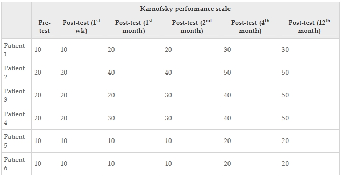 我們用來評(píng)估痙攣的MAS值在左側(cè)和右側(cè)均顯著下降。FIM量表包括運(yùn)動(dòng)得分和認(rèn)知得分,并在前測(cè)后測(cè)分析中顯示顯著增加。干預(yù)前后參與者的卡氏能力量表值的差異具有統(tǒng)計(jì)學(xué)意義。