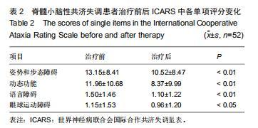 脊髓小腦性共濟失調患者52個療程治療結束1個月與治療前ICARS各單項:姿勢和步態障礙、動態功能(共濟運動、描圖)障礙、語言障礙、眼球運動障礙評分比較差異有顯著性意義。