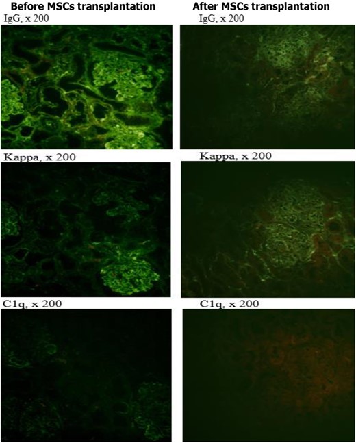 接受間充質干細胞移植后,腎臟活檢的免疫熒光顯示腎小球血管環中的免疫炎癥過程減少:IgG、kappa 和 C1q 染色強度降低。