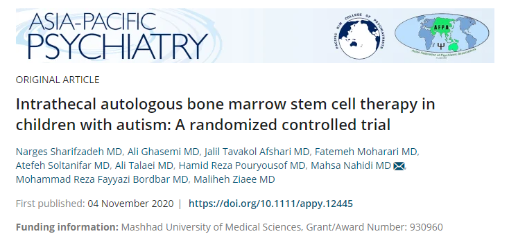 近年來,馬什哈德醫(yī)科大學(xué)在《Wiley Online Library》雜志上發(fā)布了一篇《自閉癥兒童鞘內(nèi)自體骨髓干細(xì)胞治療:一項(xiàng)隨機(jī)對(duì)照試驗(yàn)》,結(jié)果顯示鞘內(nèi)注射自體骨髓間充質(zhì)干細(xì)胞似乎是安全可行的,但在治療兒童自閉癥方面的臨床療效有限。