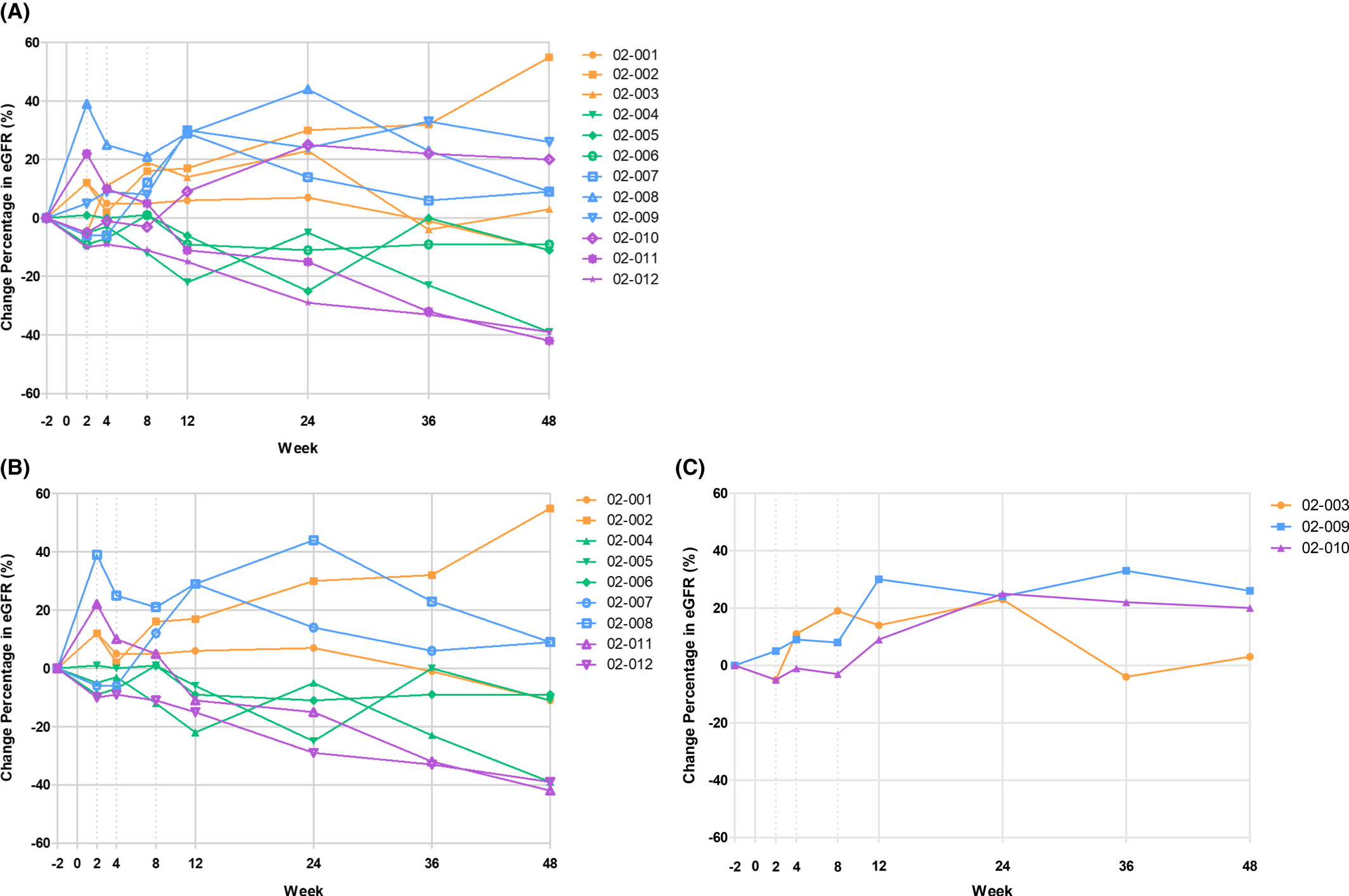 在第24周時,12名受試者中有7名 (58%) 和第48周時12名受試者中有6名 (50%) 觀察到eGFR增加。此外,在一周后,在幾名受試者中觀察到eGFR以某種方式穩定或下降。