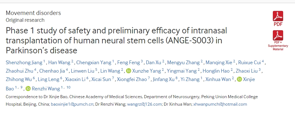 2024年5月10日,北京協和醫院神經外科王任直教授、包新杰教授和神經內科萬新華教授團隊從5年前啟動了一項《人類神經干細胞鼻腔內移植治療帕金森病的安全性及初步療效的1期研究(ANGE-S003)》的臨床研究成果在國際期刊《Journal of Neurology, Neurosurgery& Psychiatry》上發表。[3]