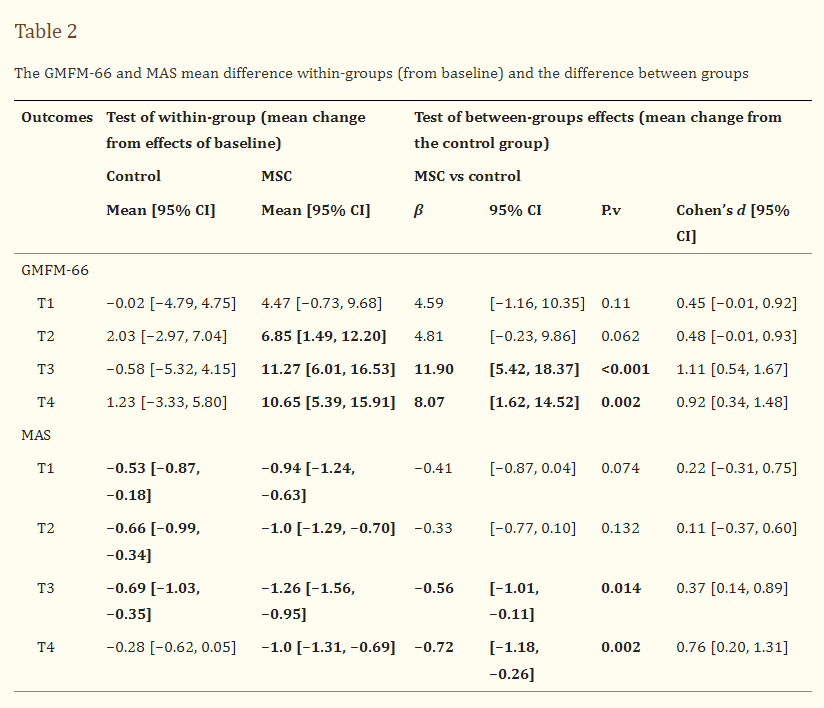 其他量表的評估顯示,從基線到細胞注射后12個月的平均MAS評分顯著下降((圖4B),并且臍帶間充質干細胞移植組的平均變化在統計學上高于具有較大效應量的對照組(表2)。