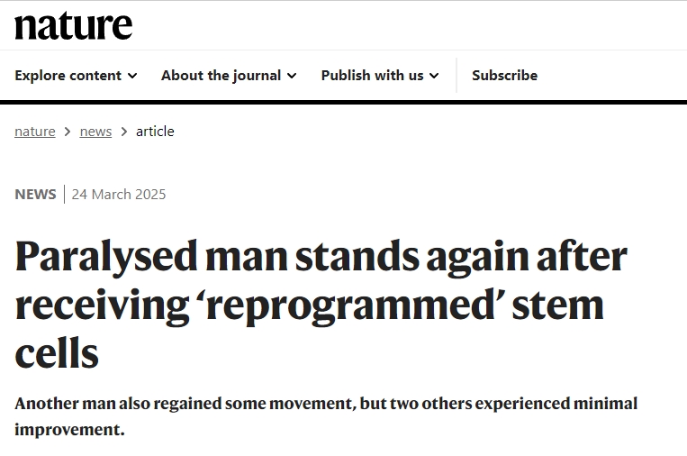 2025年3月24號,日本慶應(yīng)義塾大學(xué)教授岡野秀之領(lǐng)導(dǎo)的研究小組宣布首個利用誘導(dǎo)多能干細(xì)胞在治療脊髓損傷方面取得重大突破。該研究結(jié)果發(fā)表在權(quán)威期刊雜志《nature》上。