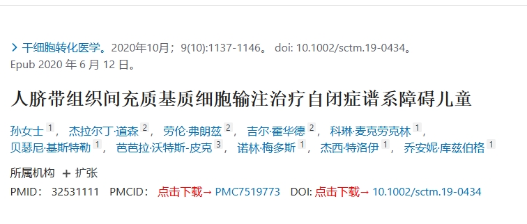 2020年,在另一項研究中,學者們給自閉癥兒童注射了三劑人臍帶組織 MSCs,間隔2個月,結果發現一部分研究參與者產生了 I 類抗人類白細胞抗原 (HLA) 抗體;然而,這些抗體在臨床上沒有癥狀。該研究是非隨機的,只有12名患者表現出社交技能的部分改善。