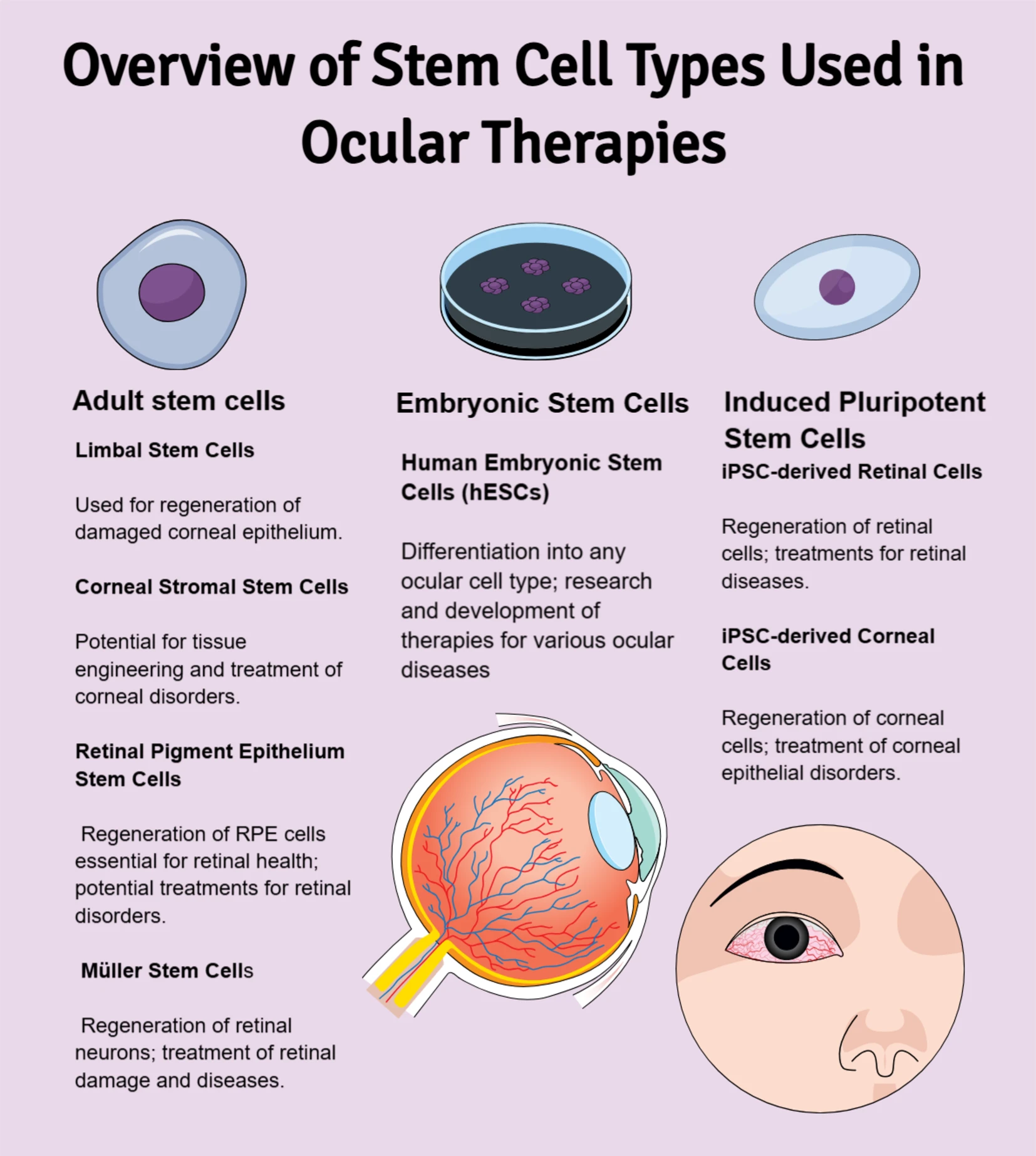 干細(xì)胞的來源、特性和治療潛力差異巨大,因此選擇合適的干細(xì)胞類型對(duì)于眼部治療的成功至關(guān)重要。圖1概述了用于治療眼部疾病的不同干細(xì)胞類型。