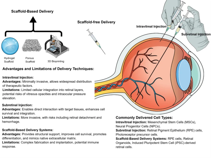 玻璃體內(nèi)注射:玻璃體內(nèi)注射是指將干細(xì)胞直接送入玻璃體腔,從而進(jìn)入視網(wǎng)膜和視神經(jīng)。這種方法創(chuàng)傷性小,能夠廣泛分布治療因子。然而,其挑戰(zhàn)包括細(xì)胞整合到視網(wǎng)膜層中的程度有限,以及潛在的并發(fā)癥,例如玻璃體混濁或眼壓升高。玻璃體內(nèi)注射通常用于間充質(zhì)干細(xì)胞 (MSC),其作用機(jī)制為旁分泌信號(hào)傳導(dǎo),而非直接整合。