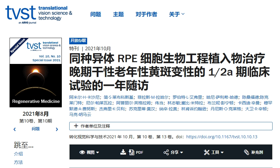 2024年,一項(xiàng)“干細(xì)胞衍生的生物工程視網(wǎng)膜色素上皮植入物治療地圖狀萎縮的1/2a期臨床試驗(yàn)的長期隨訪”試驗(yàn)報(bào)告顯示,基于支架的hESC衍生的RPE植入物是安全的,并且在中位三年的隨訪中顯示出良好的視力改善效果。