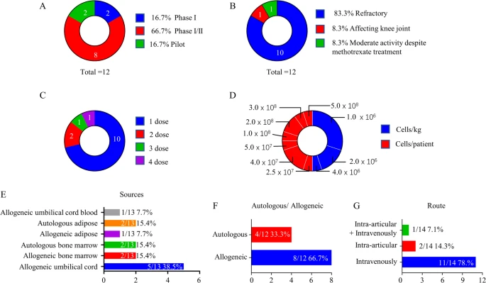 治療方案上:給藥次數(shù)以單次為主,多次給藥多為2-4劑,間隔1周至3個(gè)月(圖5C);細(xì)胞劑量多按體重計(jì)算(1–4×10?/kg),部分按固定細(xì)胞數(shù)(2.5×10?–3×10?)(圖5D);使用細(xì)胞來源包括臍帶(UC)、骨髓(BM)、脂肪(AD)和臍帶血(UCB)-MSCs(圖5E),其中UC-MSC多用于異體移植,BM/AD-MSC多用于自體移植(但BM-MSC獲取有創(chuàng)且效率較低)(圖5F);主要給藥途徑為靜脈注射(IV),關(guān)節(jié)內(nèi)注射(IA)次之,僅1項(xiàng)研究聯(lián)合使用(圖5G)。