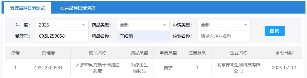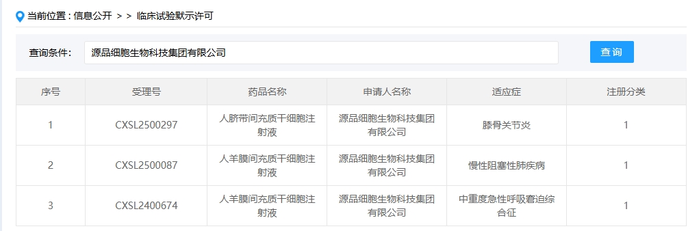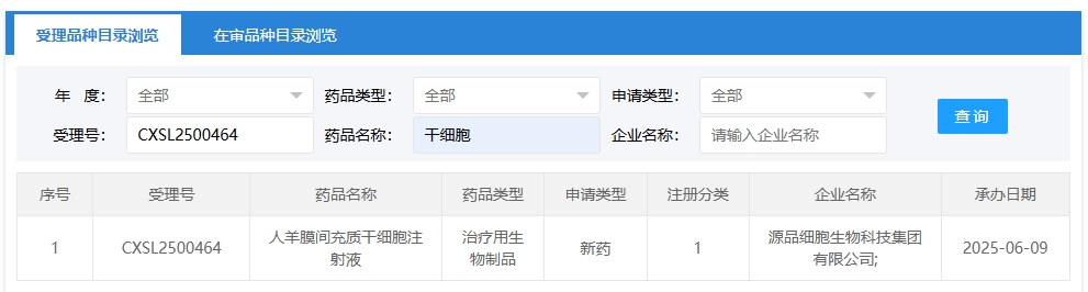 新增受理1:2025年6月9號,源品細胞生物科技集團有限公司申報的“人羊膜間充質干細胞注射液”臨床試驗申請獲受理(受理號:CXSL2500464),這是該款細胞注射液第5次獲得受理。