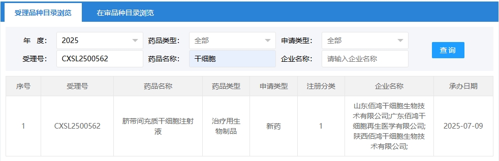 新增受理7:2025年07月09號,山東佰鴻干細胞生物技術有限公司聯合廣東佰鴻干細胞再生醫學有限公司,陜西佰鴻干細胞生物技術有限公司申報的“臍帶間充質干細胞注射液”的臨床試驗申請獲受理(受理號:CXSL2500562),這是該款細胞注射液第1次獲得受理。