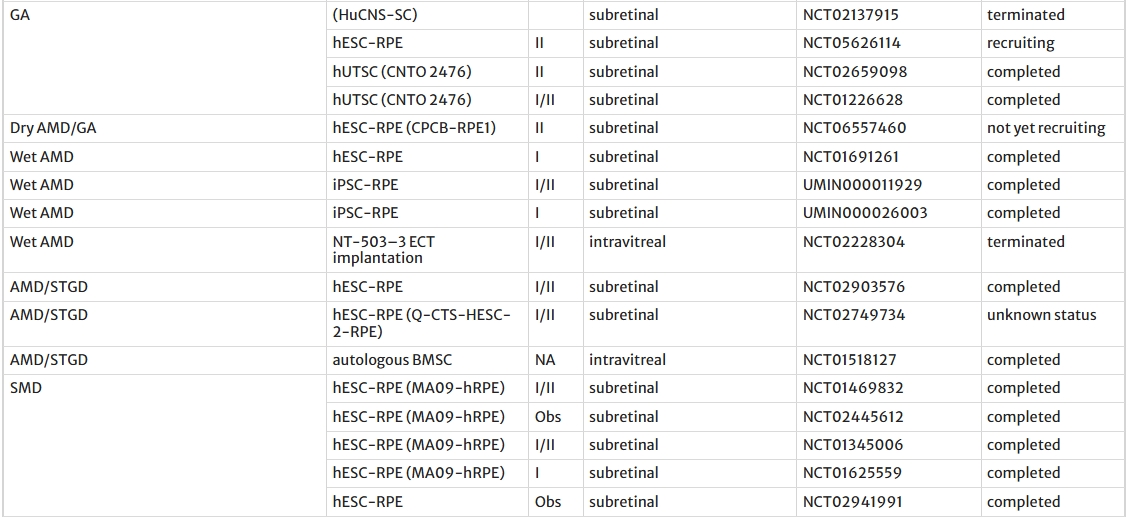 目前,全球大多數涉及基于干細胞的RDD療法的臨床試驗都圍繞hESC衍生的RPE細胞進行(表2)。