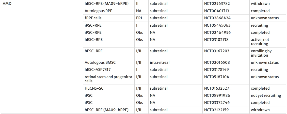 • CD34+骨髓細胞(Park團隊:NCT01736059、NCT04925687)用于AMD/RP;